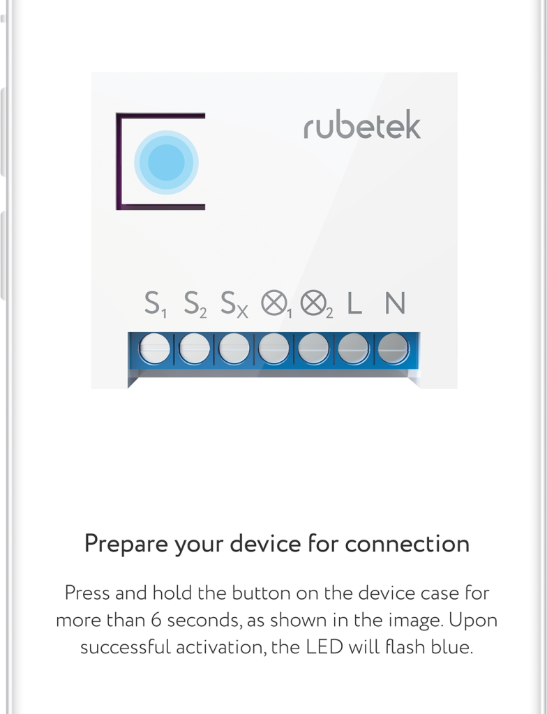 - Press and hold the button on the case max. 6 sec. If activation is successful LED will flash blue.