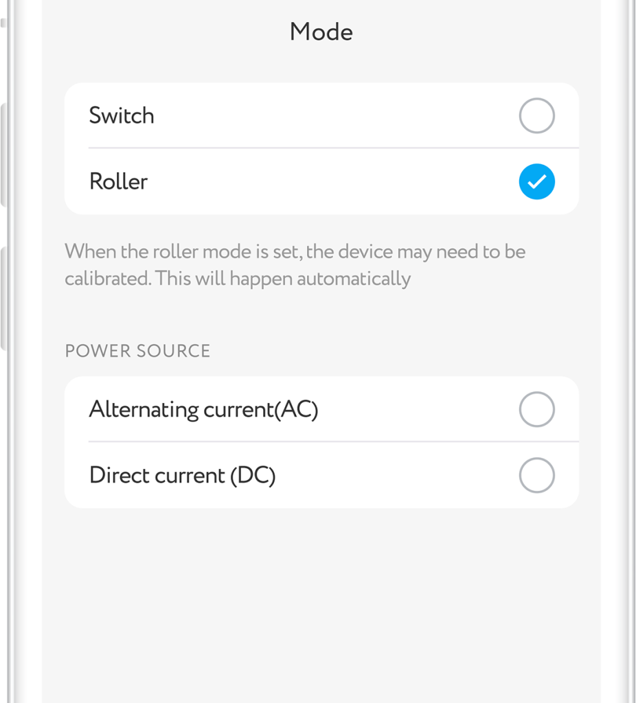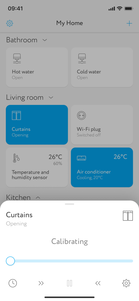 Go to control screen in application and press opening button. Wait for complete opening of curtains/gates or other equipment Press closing button and wait for complete closing. Your device has been calibrated.