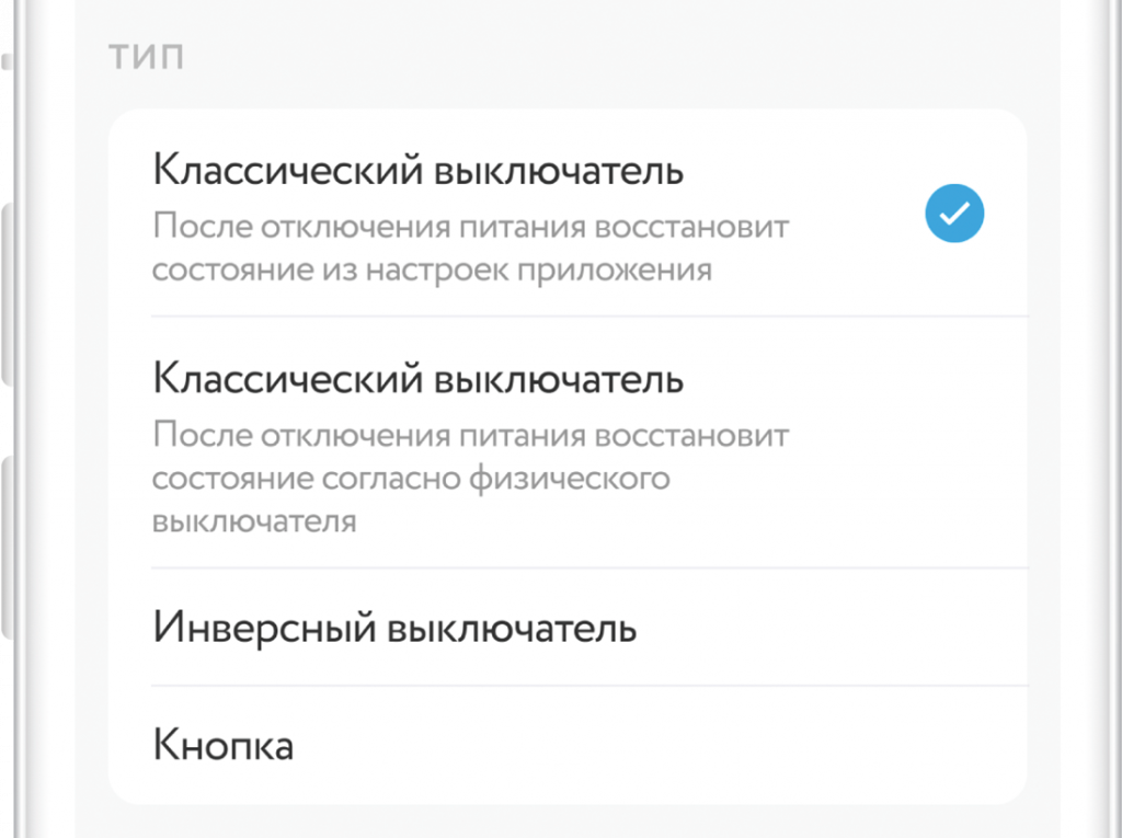 - Классический выключатель — после отключения питания восстановит состояние из настроек приложения