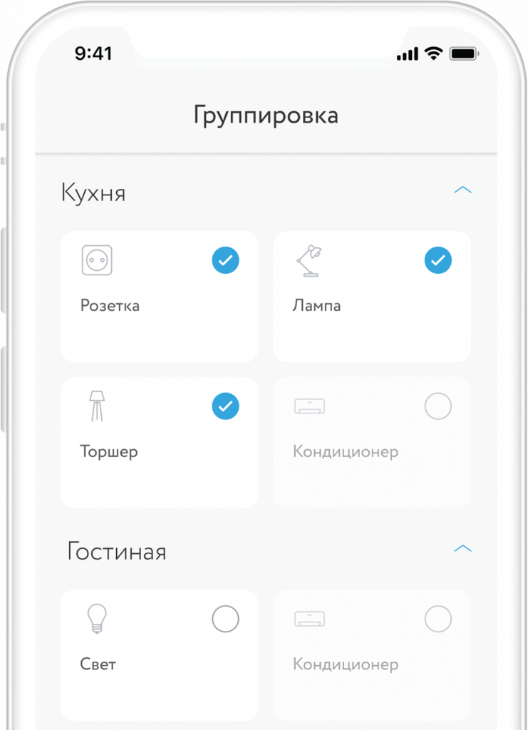 Объединяйте однотипные устройства в группы и управляйте ими одновременно. Для того чтобы создать новую группу, нажмите на «+» в верхнем правом углу главного экрана и выберите «Создать группу».