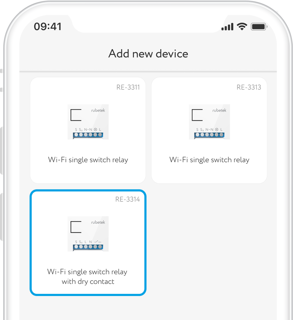 - Select section Power supply → Flush-mounting→ Wi-Fi single switch relay with dry contact RE-3314