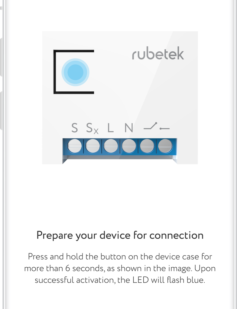 - Press and hold the button on housing for more than 6 sec. to put the relay to adding mode. LED shall start flashing.
