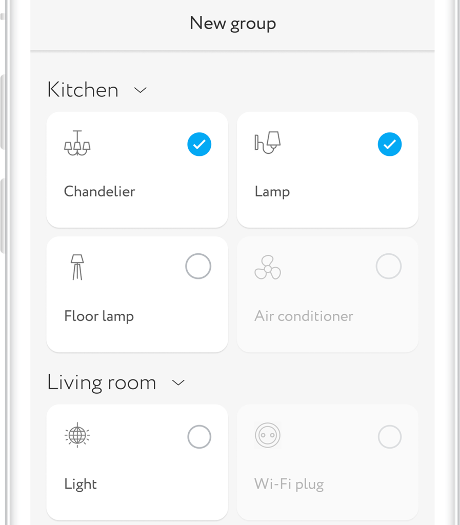 Combine devices of one type in groups and control them simultaneously. In order to create new group, press “+” in top upper angle of the main screen and select “Create group”.