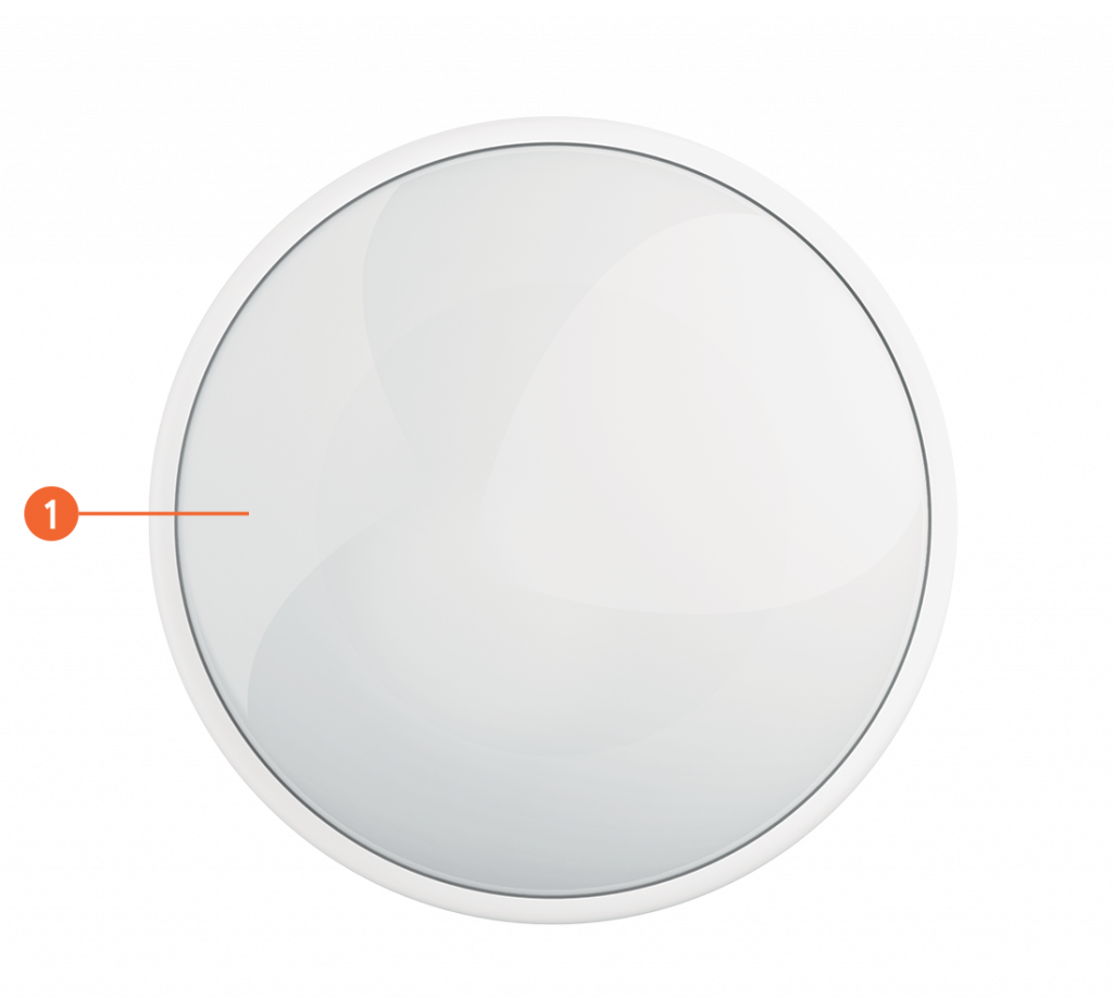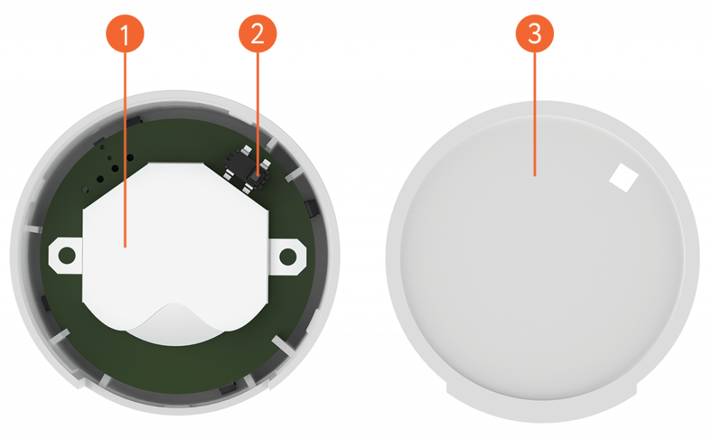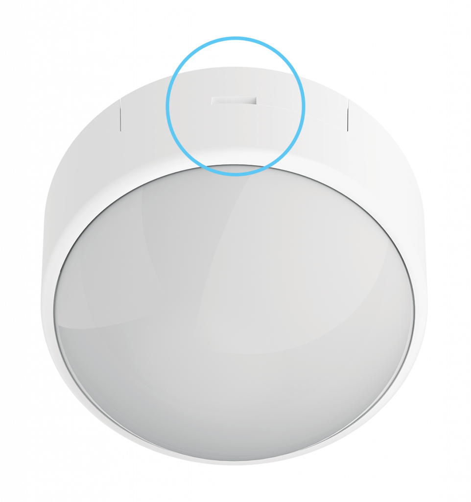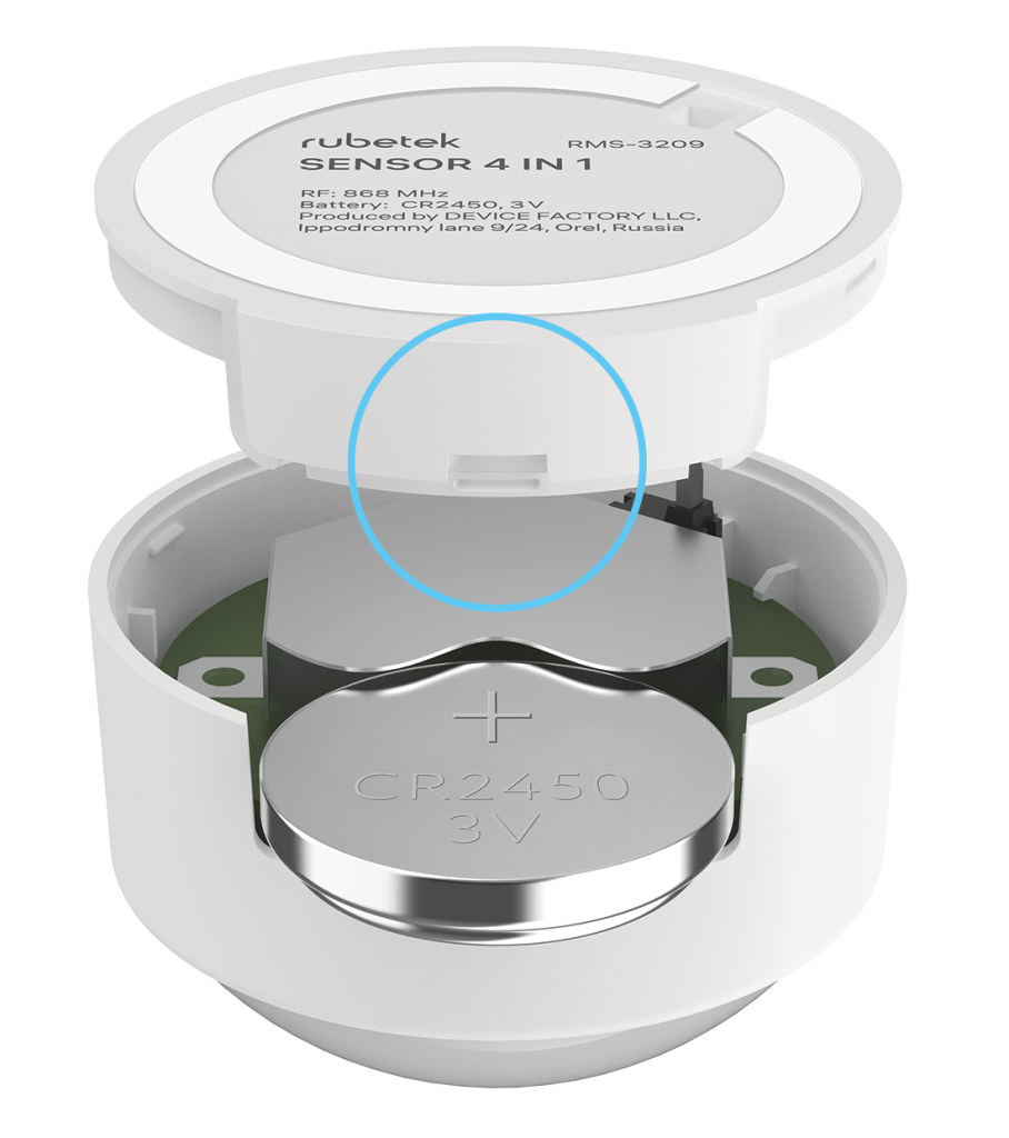 - Install sensor on flat and clean surface by means of double-sided tape, included in the scope of supply. It is important to consider orientation of the device. When locking the position of the sensor, install it so that the groove in the battery compartment cover faces upward: