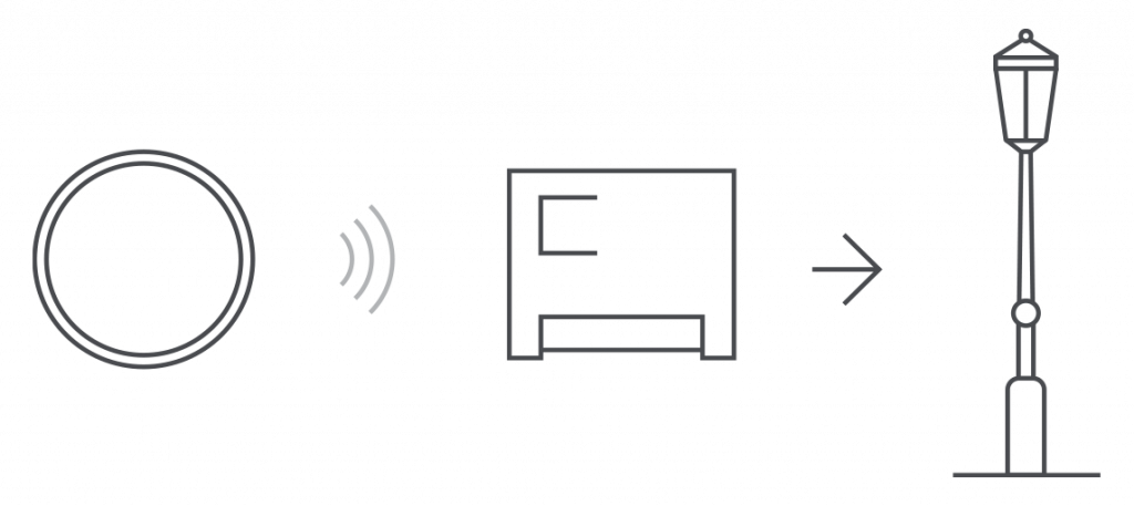 Monitor outdoor light sources according to sensor readings. Install it on window frame inside room, connect street lamps to power line using relays RE-3313 or RE-3315 and create their operation scenario depending upon outside illuminance level .