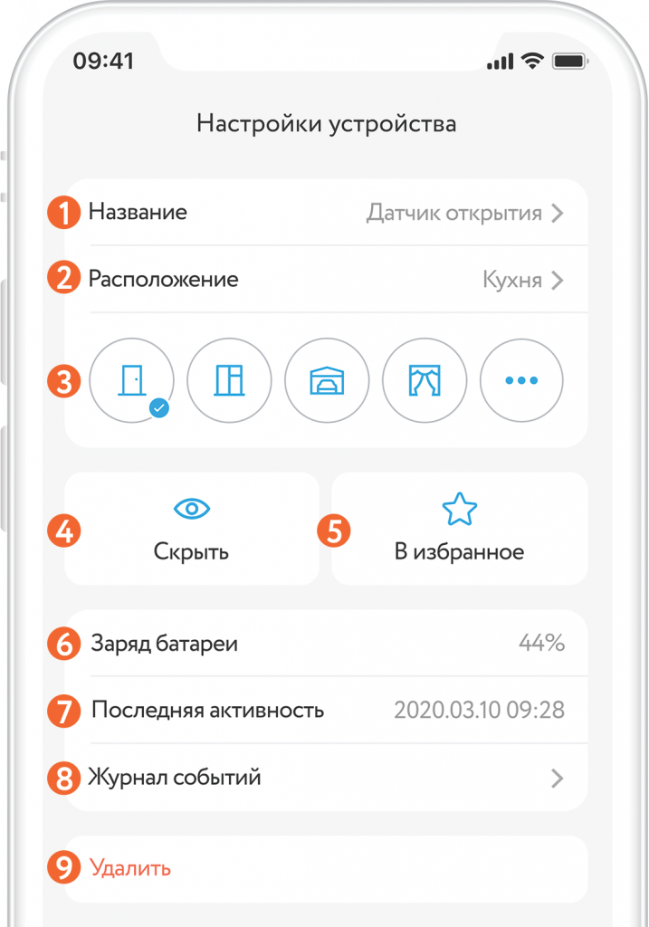 Чтобы открыть настройки Датчика, нажмите и удерживайте его плитку на экране устройств.
