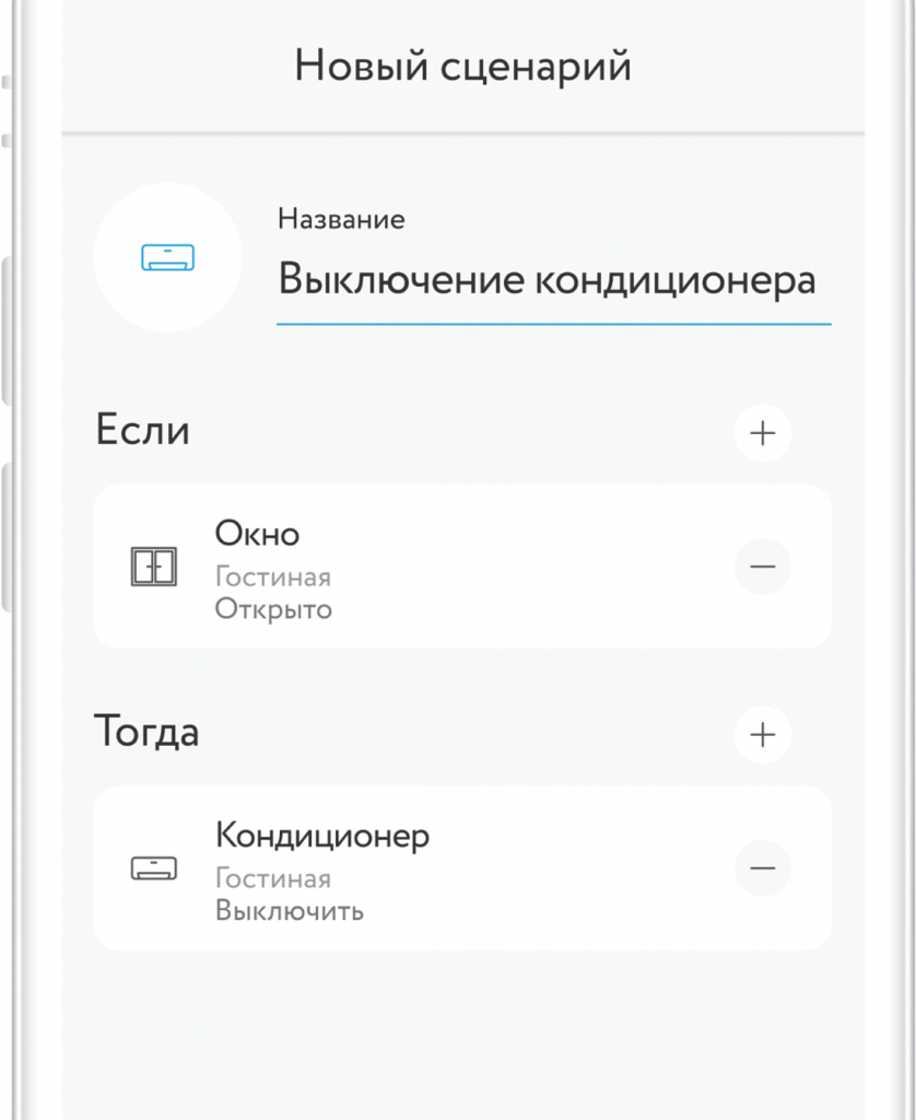 При наличии в доме исполнительных устройств можно настроить автоматические сценарии. Например, автоматическое включение света при открытии двери или выключение кондиционера при открытии окна.