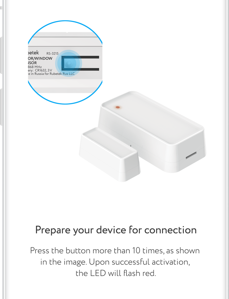 - Press button on the back of sensor five times to put sensor in adding mode. If activation was successful LED will start flashing