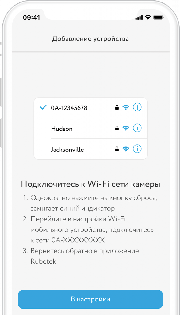 Устройство поддерживает работу только в сетях 2.4 ГГц, это следует учитывать при добавлении Камеры в мобильное приложение rubetek.