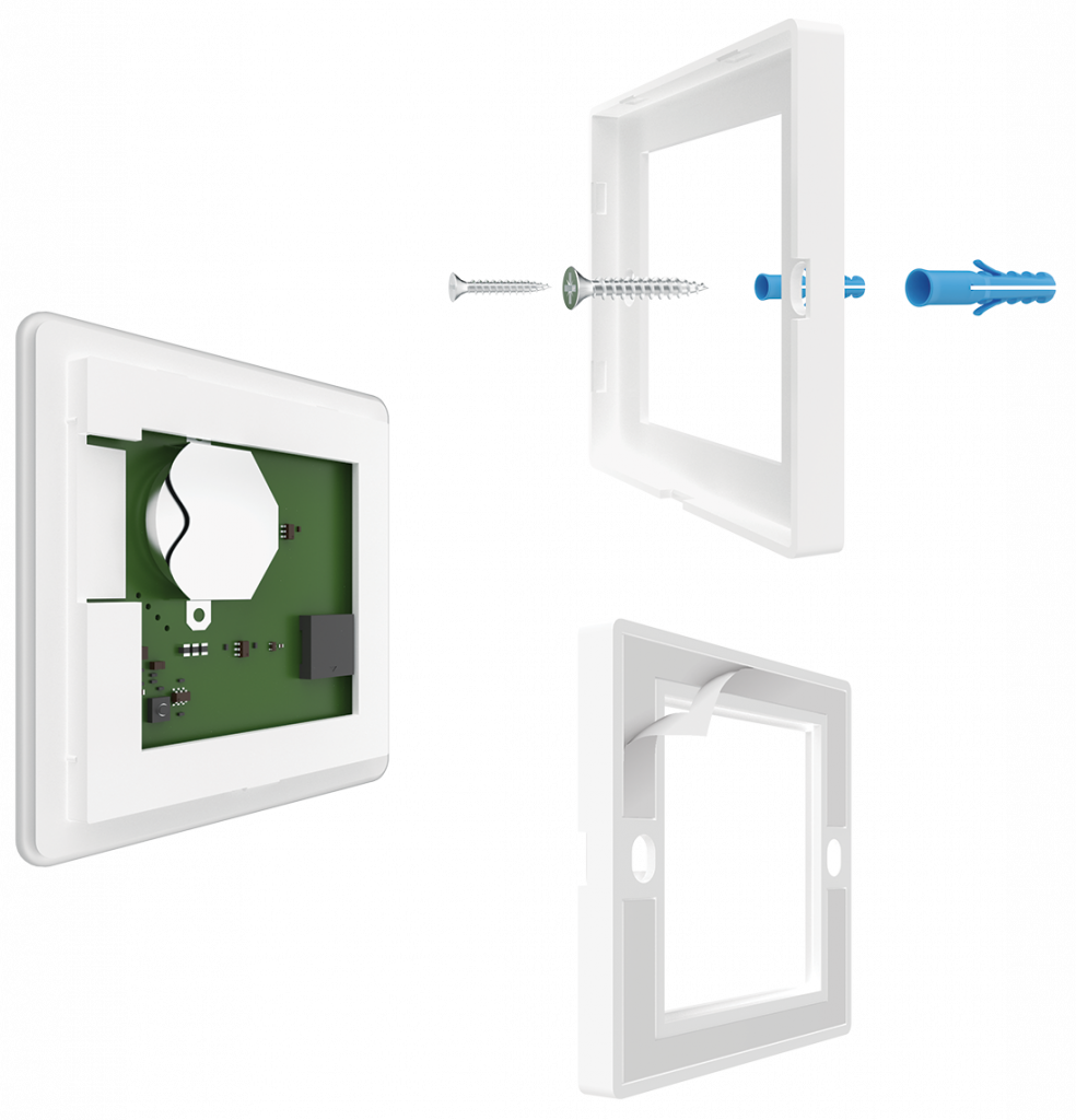 - Fasten the frame by means of two self-tapping screws or glue it to flat surface, using double-sided adhesive tape on the frame.