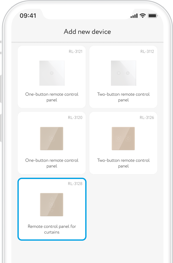 - Select section Lighting → Switches → Remote control panel for curtain RL-3128