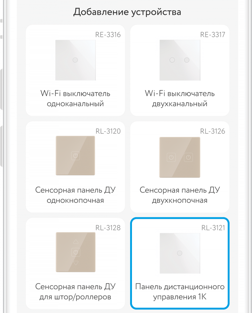 - Выберите раздел Освещение → Выключатели → Панель управления 1К RL-3121 или 2К RL-3122