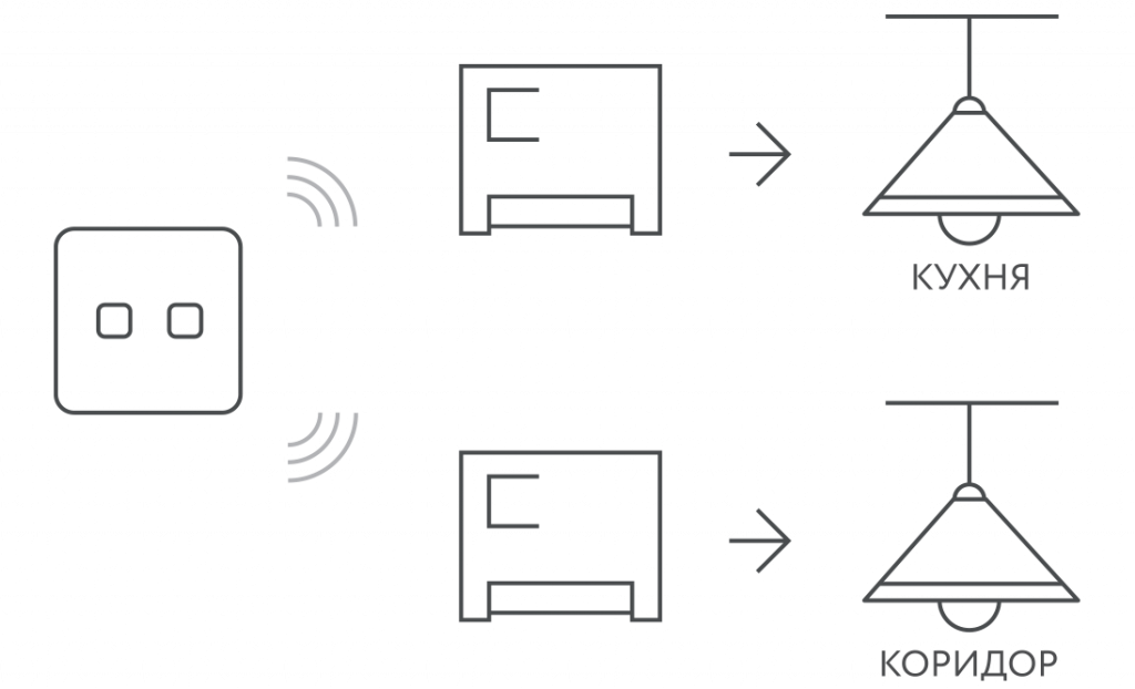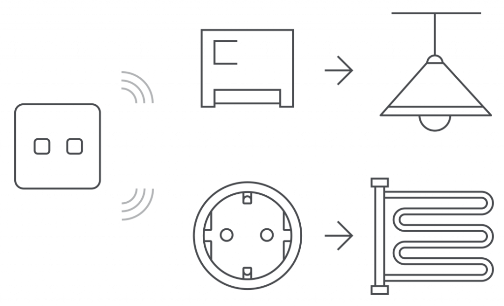 В сочетании с другими устройствами, например, с двумя Блоками управления RE-3311 или RE-3312 можно создать автономную систему управления несколькими группами освещения с помощью одной Панели в доме. Подключите Блоки управления к источникам освещения и настройте сценарий работы групп освещения в зависимости от касания сенсора Панели управления.