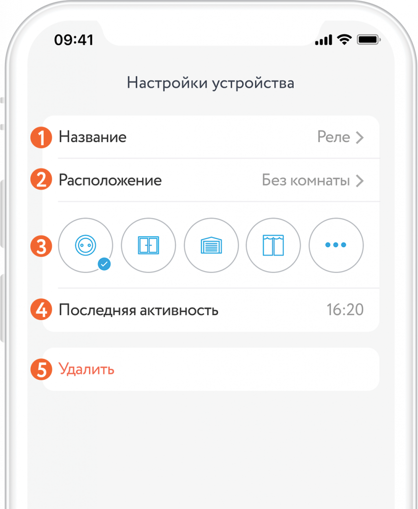 Если реле подключилось к Центру Управления, в мобильном приложении откроется меню Об устройстве, где можно задать имя устройству, выбрать расположение и иконку.