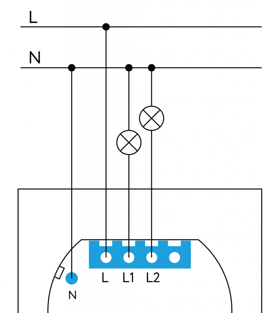 L1, L2 – разъём для подключения нагрузки (лампы, люстры и т.п.).
