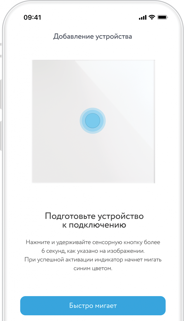 - Чтобы перевести устройство в режим добавления, нажмите и удерживайте сенсорную кнопку более 6 секунд. При успешной активации индикатор начнет мигать синим цветом