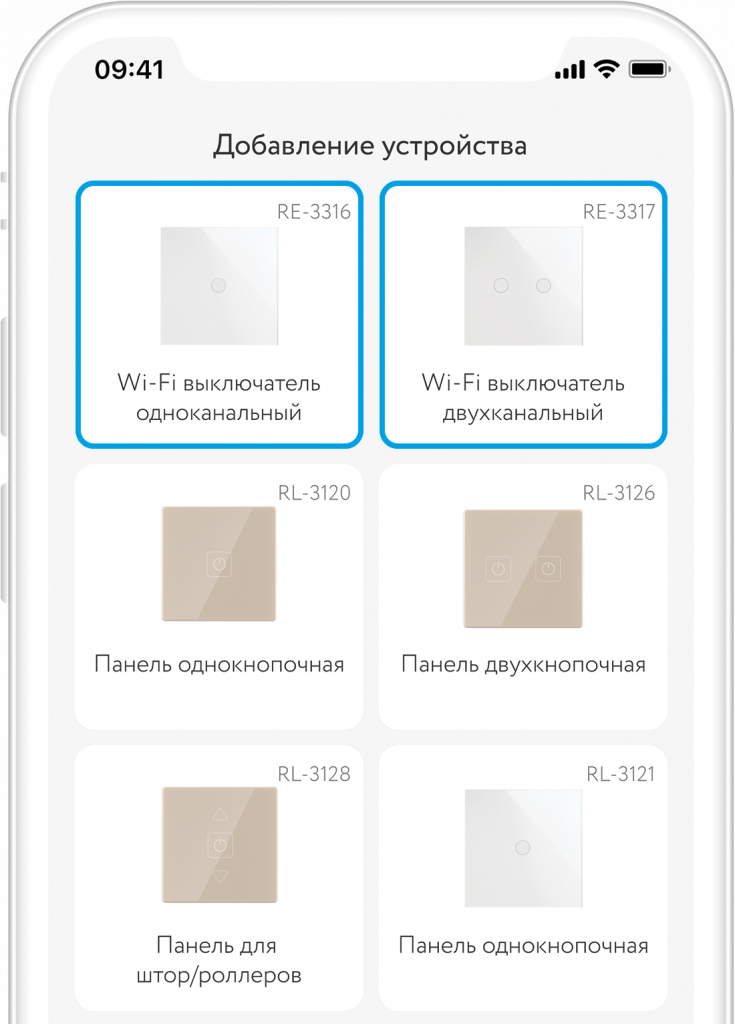 - Выберите раздел Освещение → Выключатели → Wi-Fi выключатель RE-3316 или RE-3317