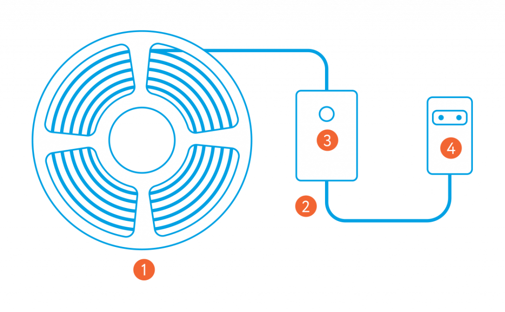 LED tape is equipped with smart control unit with button to be added to rubetek application or to switch on/off tape lighting. After connecting the smart tape to the 12 V power block and adding the device to the rubetek app, you will be able to control the color, brightness and on/off light settings on a timer or scenario.