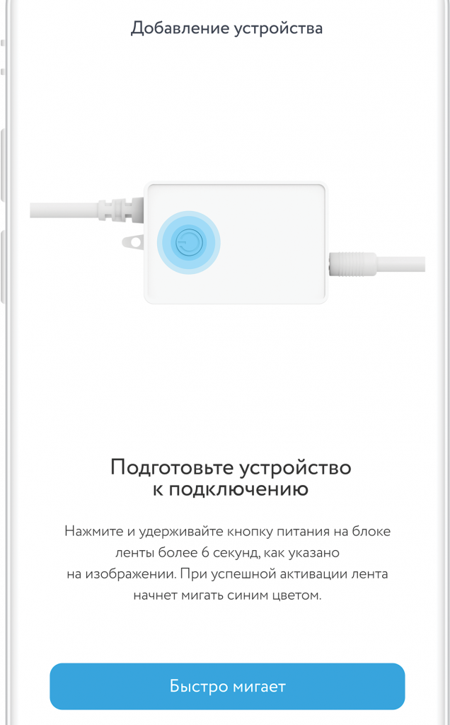 - Put LED tape to adding mode. To do it press and hold power button on Wi-Fi controller for more than 6 sec and follow tips on a screen.