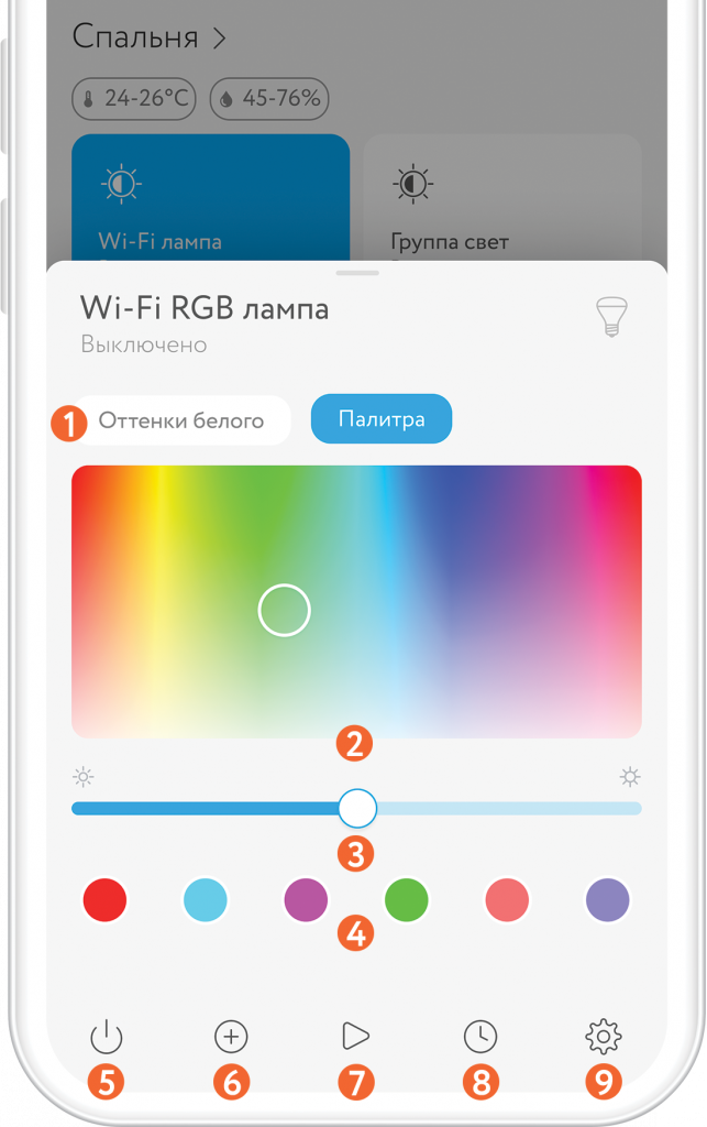After connecting the Smart RGB bulb to the 220 V mains and adding the device to the rubetek app, you will be able to control the color, brightness, and on/off light settings on a timer or scenario.