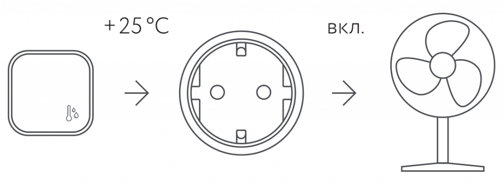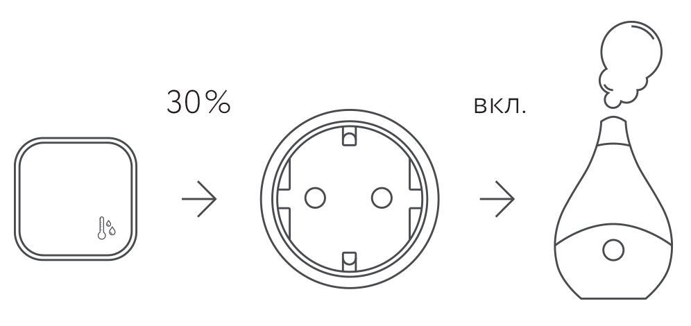 Климат — в сочетании с датчиком температуры и влажности можно настроить работу увлажнителя воздуха.