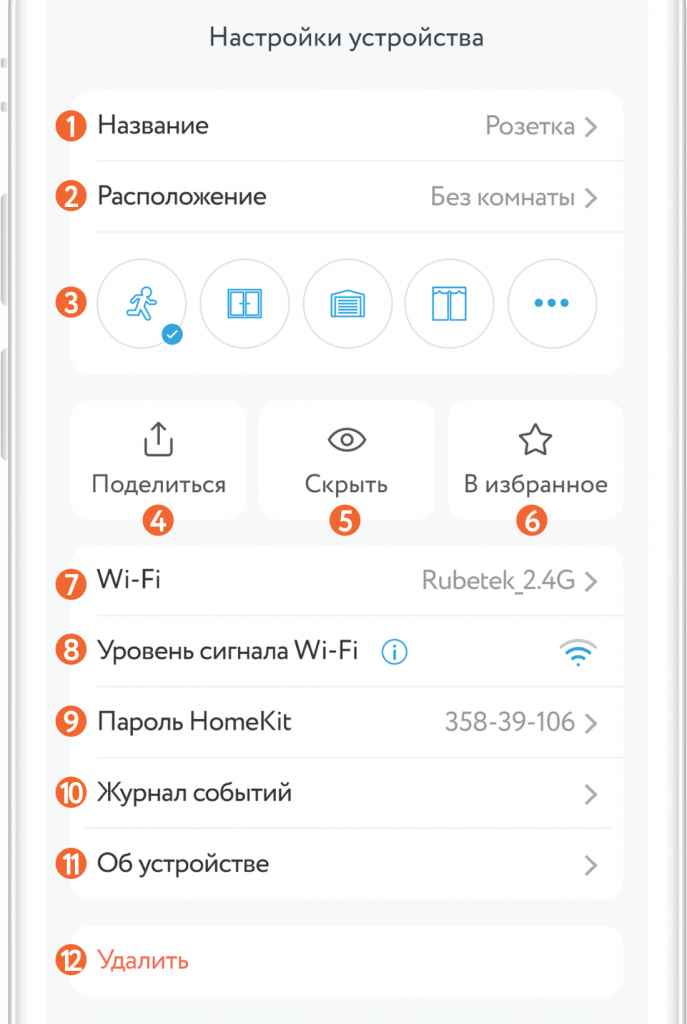 Попасть в настройки устройства можно из шторки управления Розеткой.