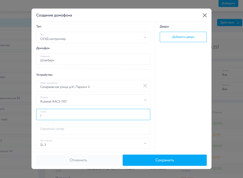 - Ввести адрес дверей.