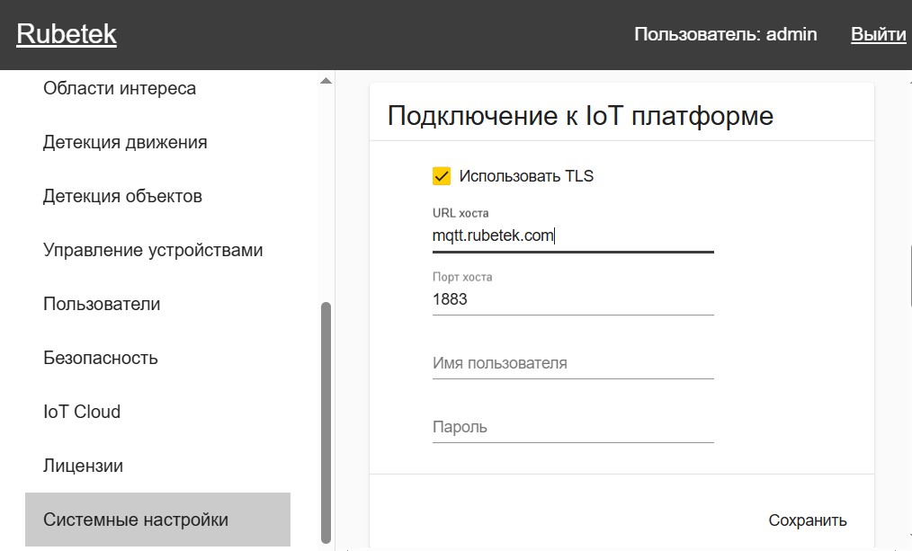 Затем выберите пункт меню Настройки => Системные настройки. Пролистайте страницу вниз до раздела Подключение к IoT платформе, выставьте маркер Использовать TLS и в полях ниже задайте следующие параметры: