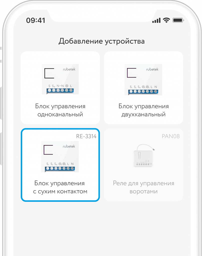 - Выберите раздел Электропитание → Скрытый монтаж → Блок управления с сухим контактом RE-3314