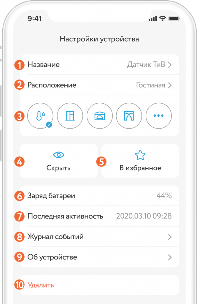 Чтобы открыть настройки Датчика, нажмите и удерживайте его плитку на экране устройств.