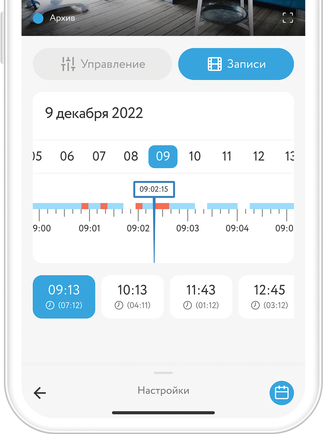 В разделе «Записи» вы сможете найти все видеозаписи, сделанные Устройством, организованные по дате и времени.