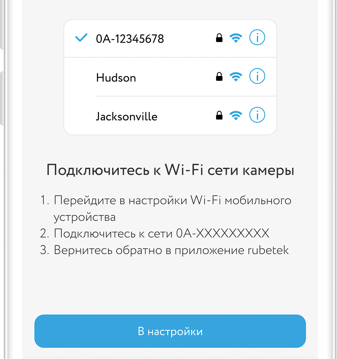 При добавлении через точку доступа: Нажмите на кнопку «В настройки» в приложении rubetek;