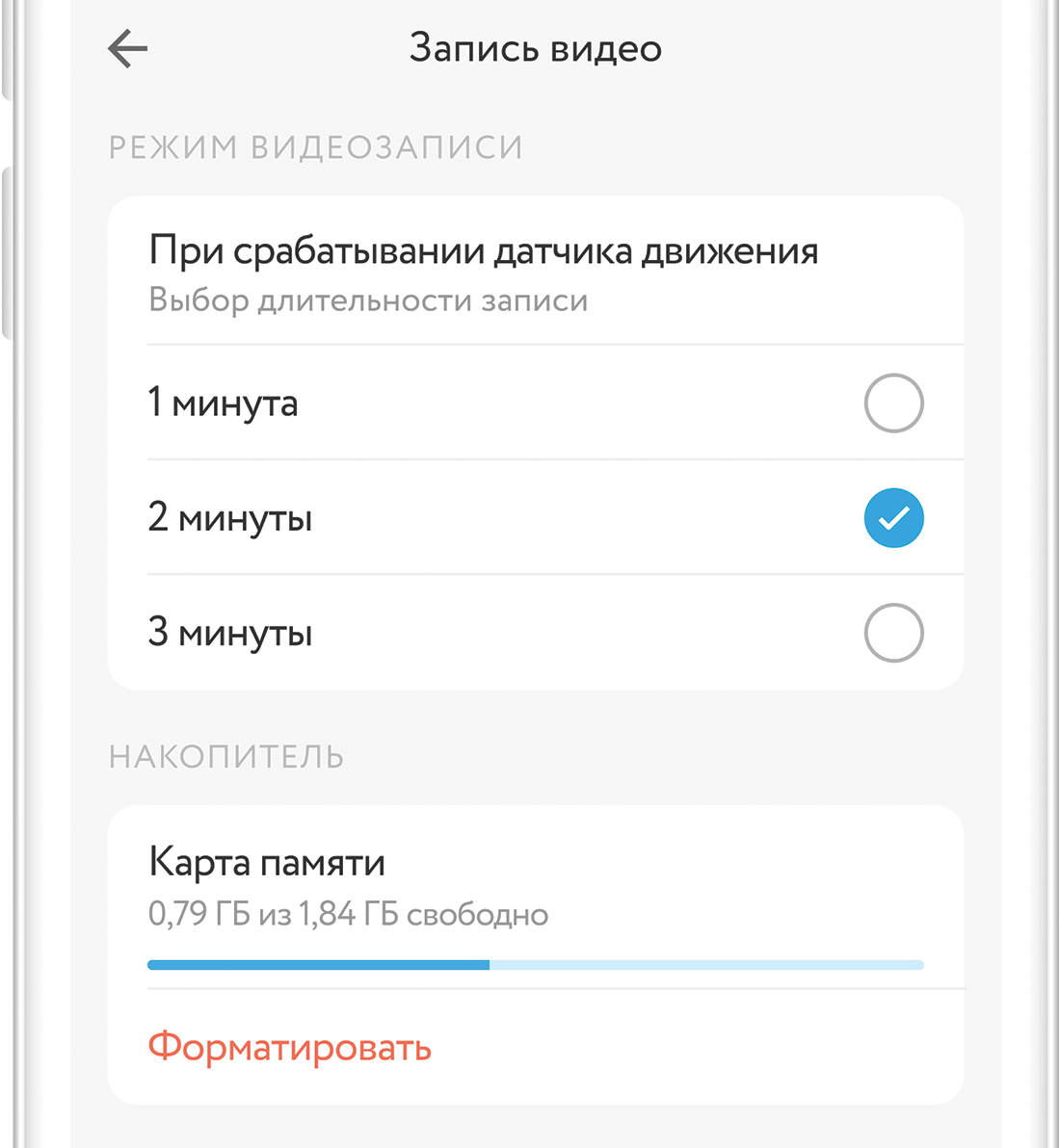 Датчик движения — управление встроенным PIR датчиком. Если датчик включен, при обнаружении движения начнётся запись видео на карту памяти и вы получите уведомление на смартфон*.