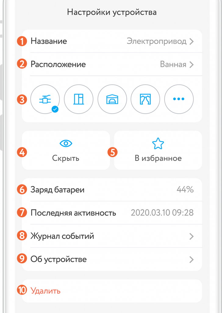 Попасть в настройки устройства можно из шторки управления Электроприводом.