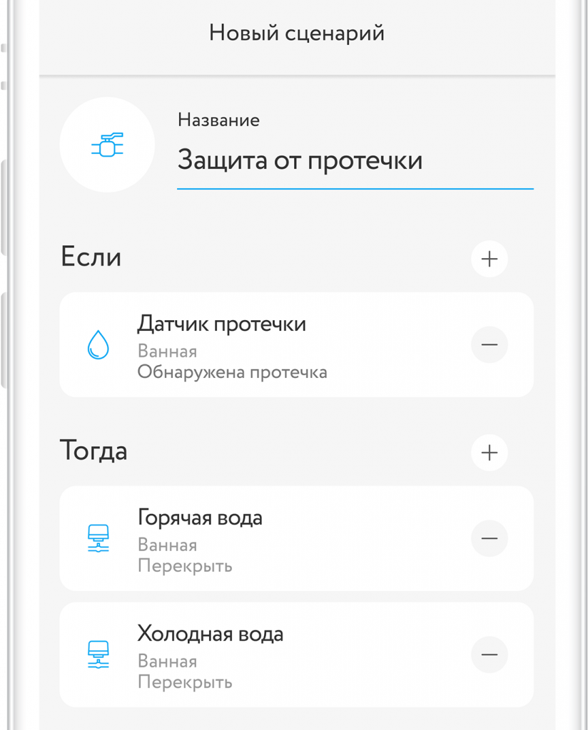 Создавайте сценарии автоматической работы подключённых устройств. Например, настройте работу Электропривода в зависимости от состояния Датчика протечки RS-3225.