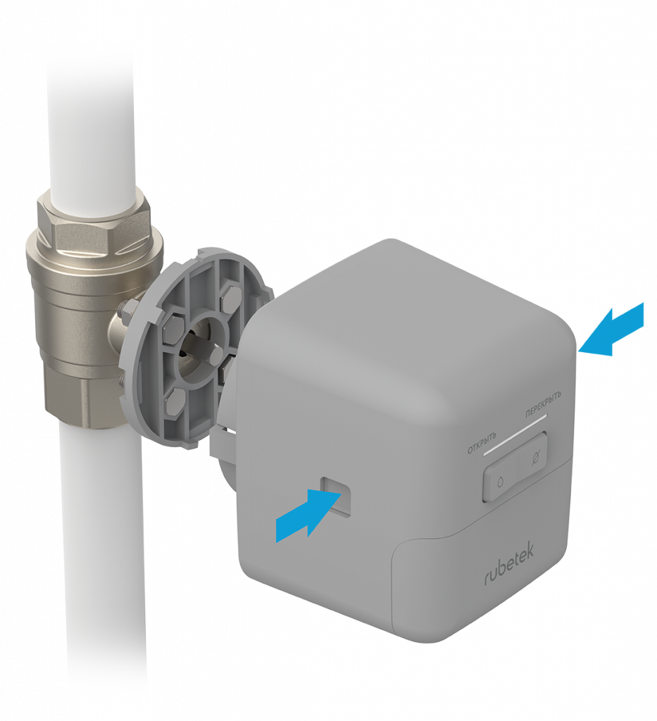 - Зажмите кнопки фиксации по бокам корпуса Электропривода и установите его на крепёжный диск. Положение выемок диска должно совпадать с фиксаторами на корпусе Электропривода. Отпустите кнопки и убедитесь, что Электропривод надёжно зафиксирован на кране.