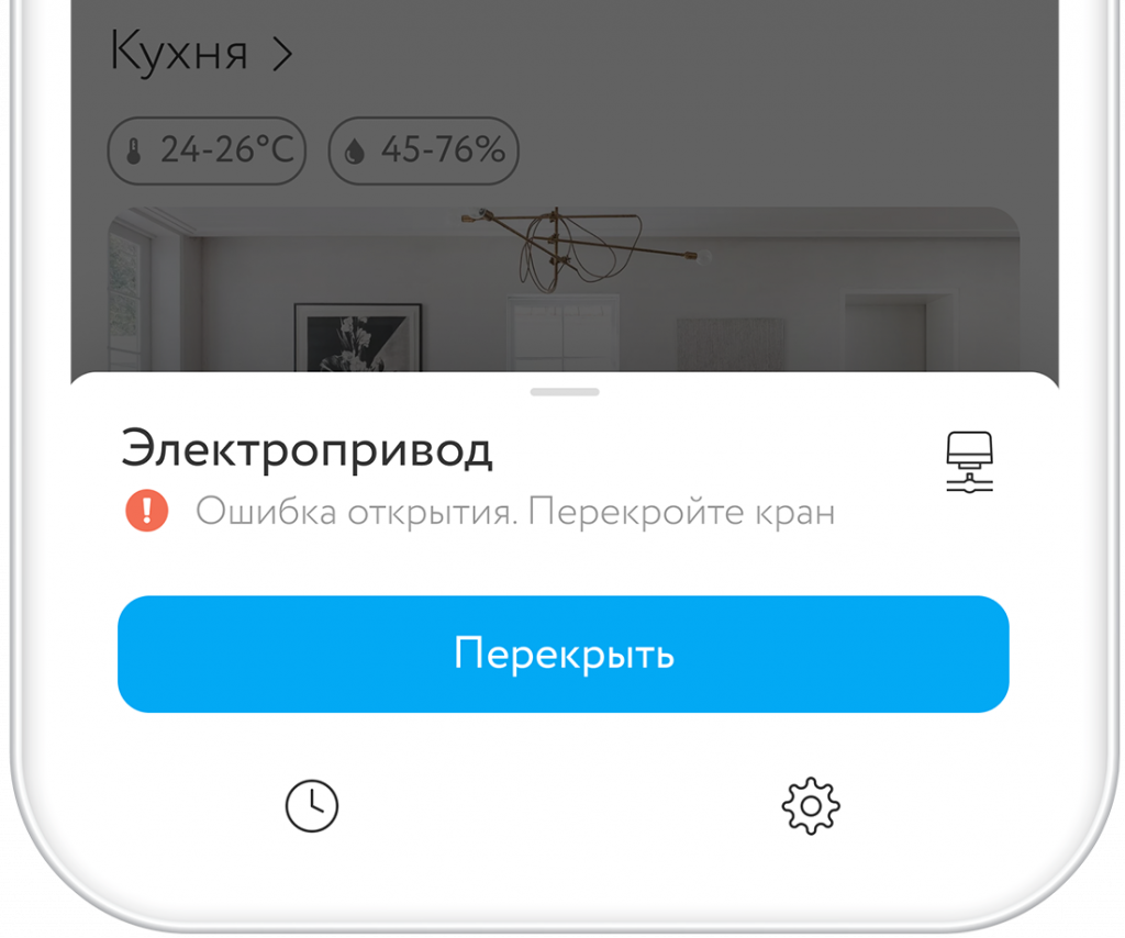 В случае возникновения ошибок в работе Привода, на шторке управления отображается соответствующее сообщение. Это значит, что Привод остановился в процессе открытия/перекрытия, не достигнув крайнего положения. Обычно, причиной этого является возникновение препятствия на пути движения крана или эрозия его механизма. Если это произошло, верните привод в исходное положение и устраните причину ошибки, а затем запустите процесс смены положения крана повторно.